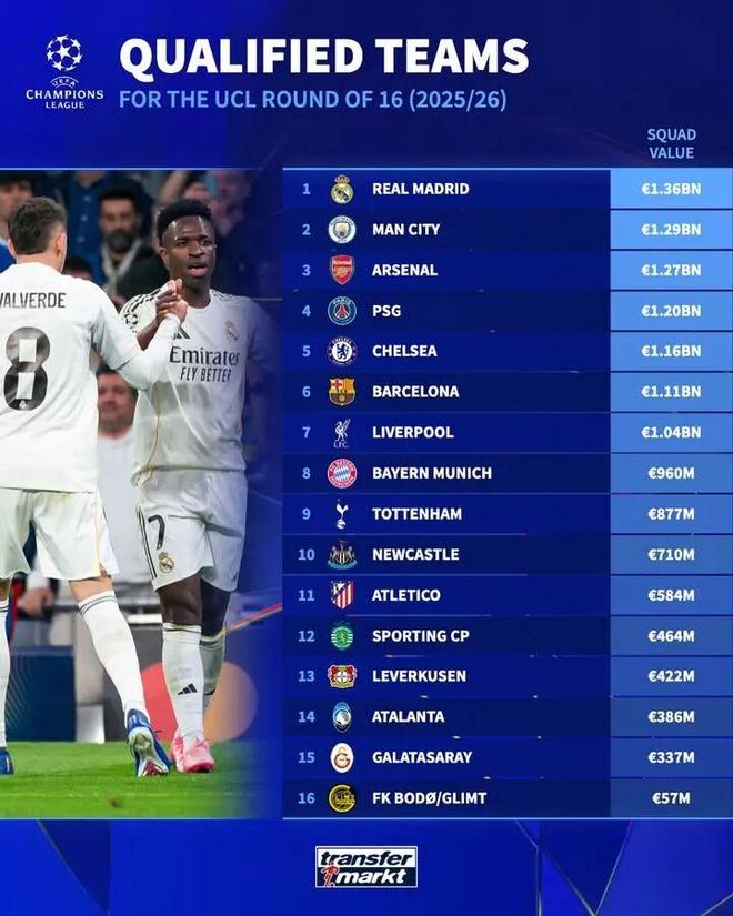 今天凌晨欧冠淘汰赛附加赛结束,本赛季16强全部出炉。德国转会市场列出各队总身价排行,皇马13.6亿欧领跑,7队破10亿,挪超黑马博德闪耀仅5700万,与其他球队存在巨大差距。