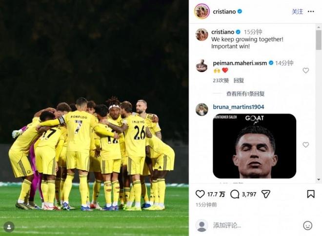 在比赛中错失点球的C罗在第81分钟被换下,有媒体拍到他在替补席接受冰敷治疗。C罗在赛后更新了社交媒体写道:“我们携手共进,这是一场非常重要的胜利。”